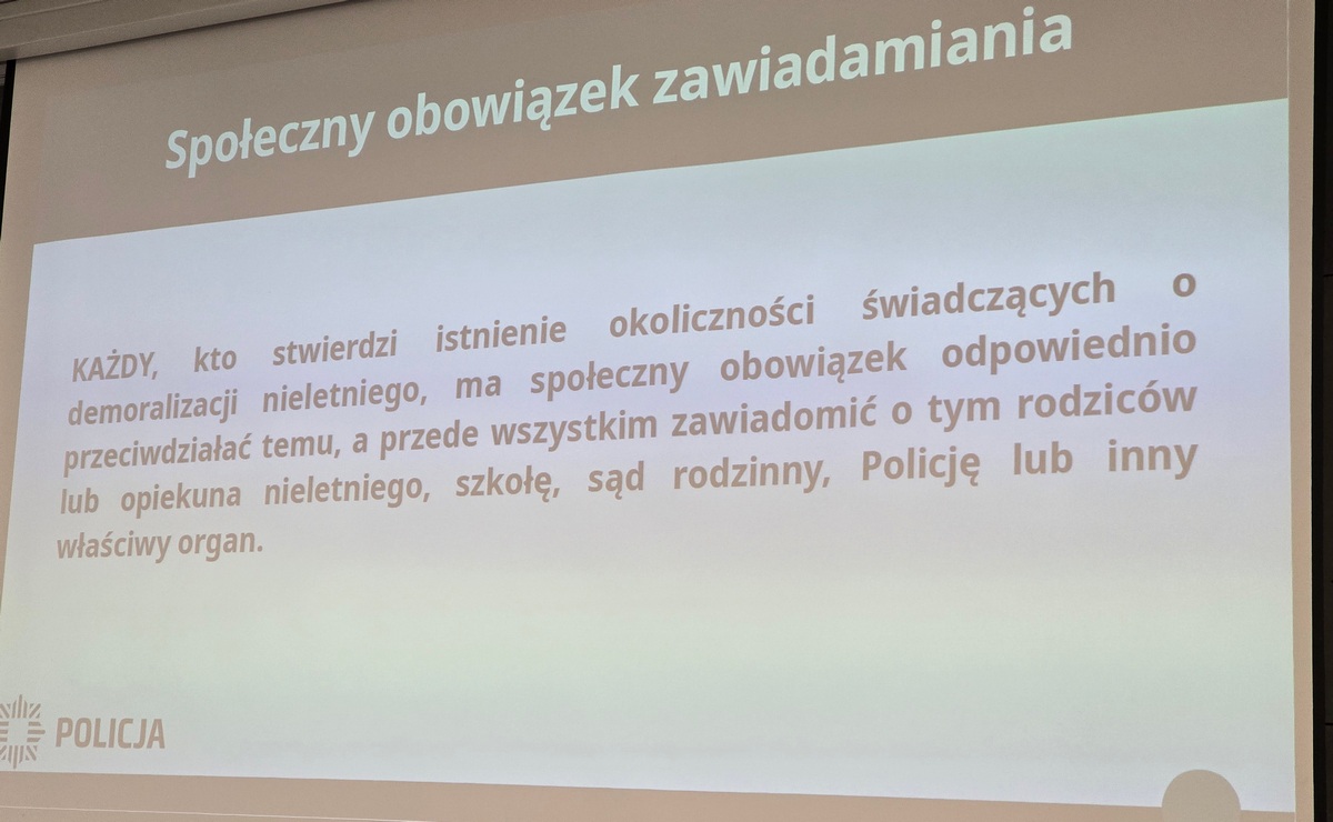 Podczas spotkania rozmawiano o odpowiedzialności karnej nieletnich, reakcjach na demoralizację, obowiązku reagowania na przemoc oraz realizacji procedury „Niebieskiej Karty” w sytuacji przemocy domowej wobec dziecka.